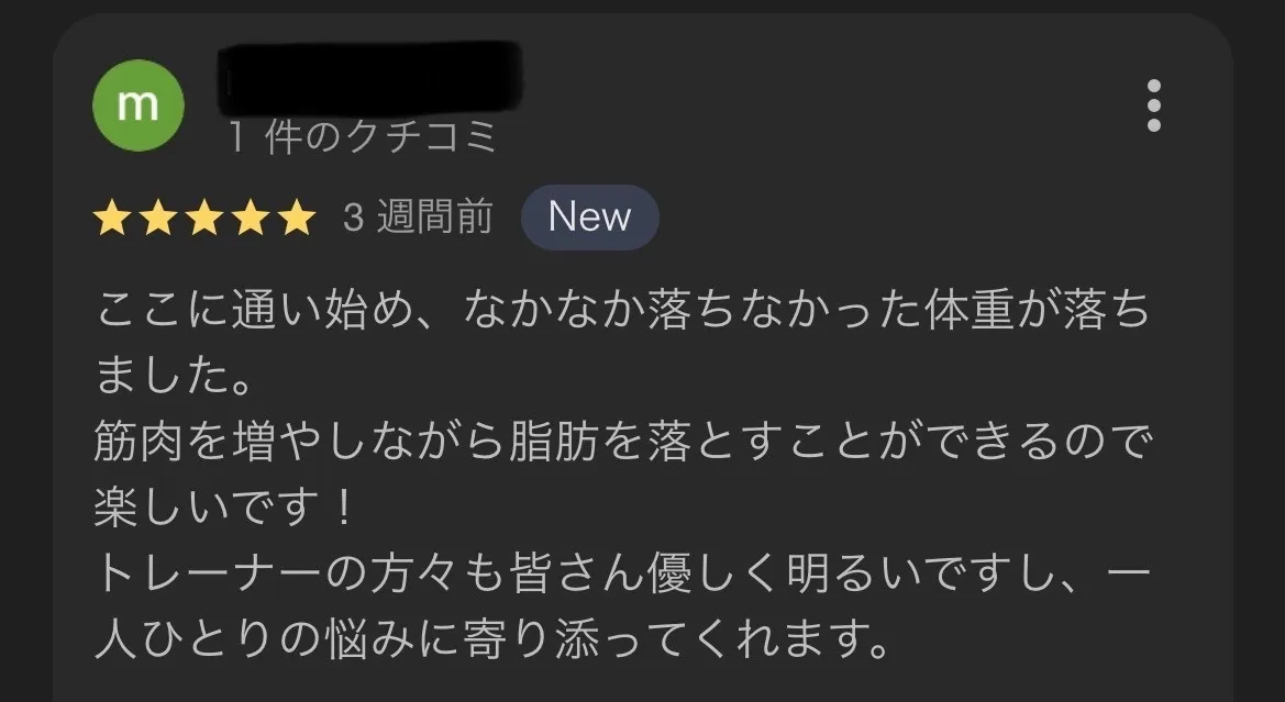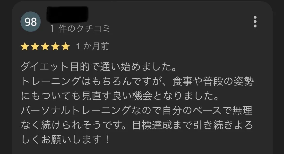 マンツーマンなのでフォームを細かく見てもらえるのと、食事もLINEでサポートしてくれるのがありがたいです。